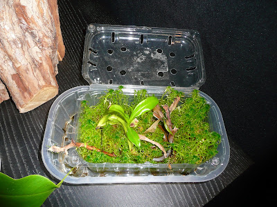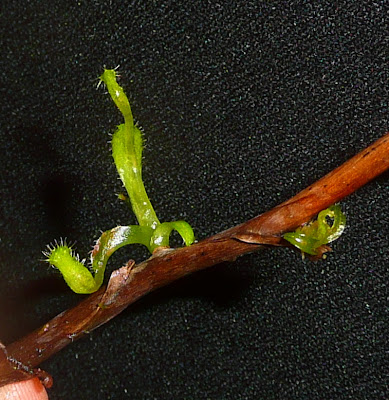 Savaitė netruko prabėgti… Spėliojimų būta ne daug, variantų – vos keletas: saulašarės arba musėkautai. Ir nė vienas jų nėra teisingas. Tai – Nepenthes – ąsotenis. Nuotraukose užfiksuoti ant ąsotenio šakutės gabalėlio išsprogę miegantys pumpurai, suformavę pirmuosius lapus jau su gaudyklių užuomazgomis.
